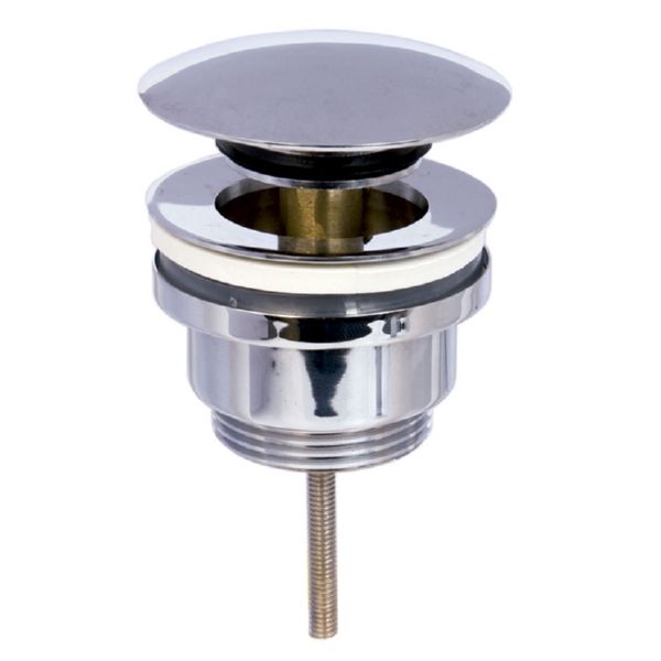 Universal para lavabo/bidé con y sin rebosadero. Tapón tipo clic-clac accionado con pulsador. Cromado. Adaptable lavabo 15-60 mm, ampliable con un tornillo de sujeción más largo. Conexión 1 1/4?x ø 63 mm.Cuerpo válvula ø 40 mm.