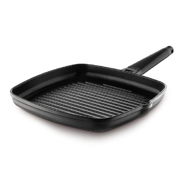 Ø 20-30 cm. Aluminio fundido indeformable. Revestimiento cerámico de alta calidad libre de PFOA y PTFE. Mangos desmontables. No apta para inducción. Asador grill 27x27 cm.