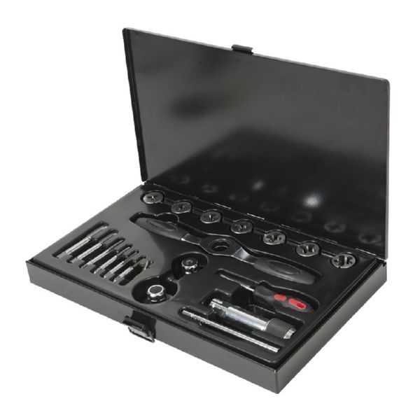 20 accesorios. Estuche metálico. Composición: 7 juegos de terrajas y machos: M3 x 0,50 mm, M4 x 0,70 mm, M5 x 0,80 mm, M6 x 1,00 mm, M8 x 1,25 mm, M10 x 1,50 mm, M12 x 1,75 mm. 1 giramachos ajustable 1 mango "T" (para el giramachos) 1 adaptador portamachos 1 adaptador portaterrajas 1 mango carraca (reversible al girar el mango) cromo-vanadio 1 destornillador para ajustes