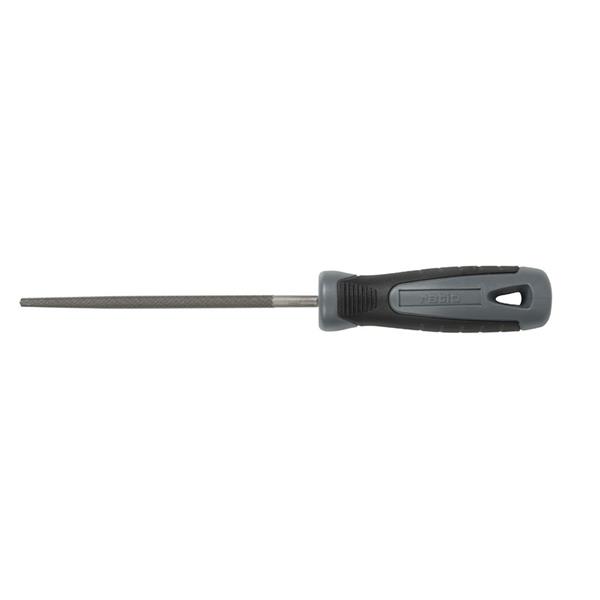 Mango plástico. Cuerpo forjado en acero al cromo. Tratamiento de templado integral. Redonda. Entrefina 6".
