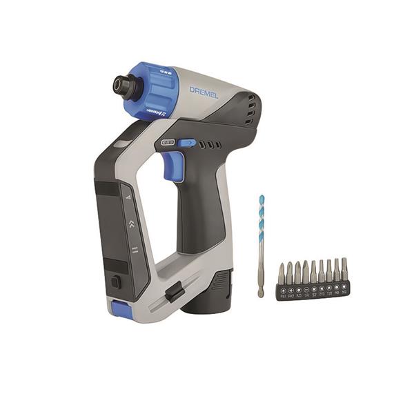 Detector integrado. Nivel láser desmontable. Set de puntas (9x Puntas de atornillar, 1x Broca multimaterial). 1 batería 12V. 20 Ah. Cargador rápido.